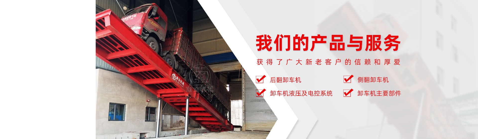 江西南金機(jī)械有限公司是一家主要從事裝卸設(shè)備研發(fā)、設(shè)計(jì)、生產(chǎn)、安裝及銷售為一體的型企業(yè)。其坐落于歷史文化名城—江西省贛州市。我公司的產(chǎn)品為系列化后翻式卸車機(jī)、側(cè)翻式卸車機(jī)及集裝箱裝卸料機(jī)。其用于各類散裝顆粒料如小麥、大豆、玉米、花生、稻谷等的自動(dòng)卸載,同時(shí)也可廣泛應(yīng)用于化工、冶金、礦山以及一切有散狀物料接收作業(yè)的場(chǎng)所。